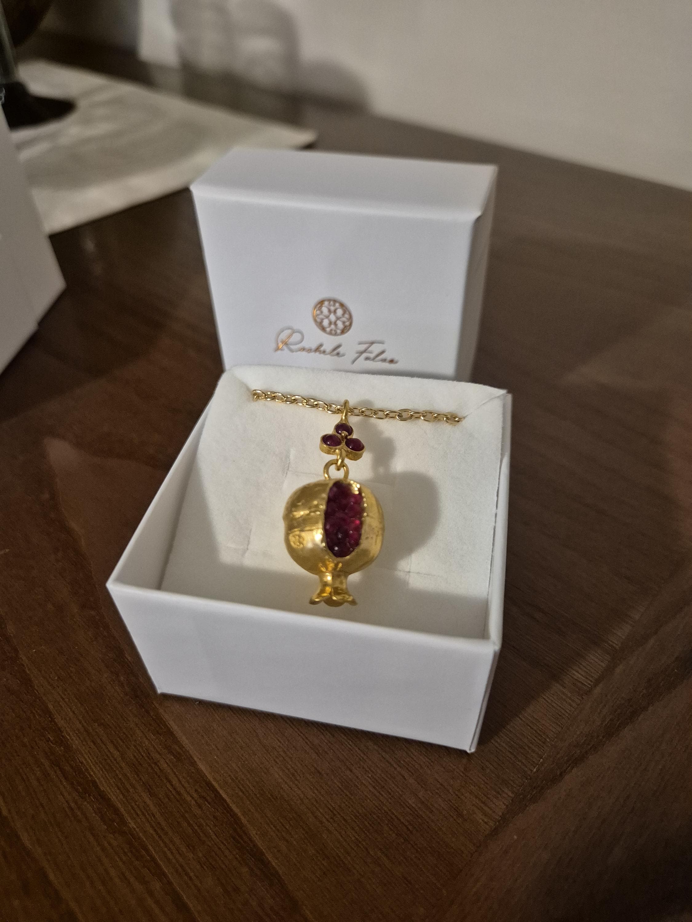 Pomegranate necklace crafted from gold over bronze and finished with natural red pomegranates. Elegant and practical, the pomegranate, a symbol of good luck and prosperity, is shipped with a box and guarantee.