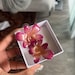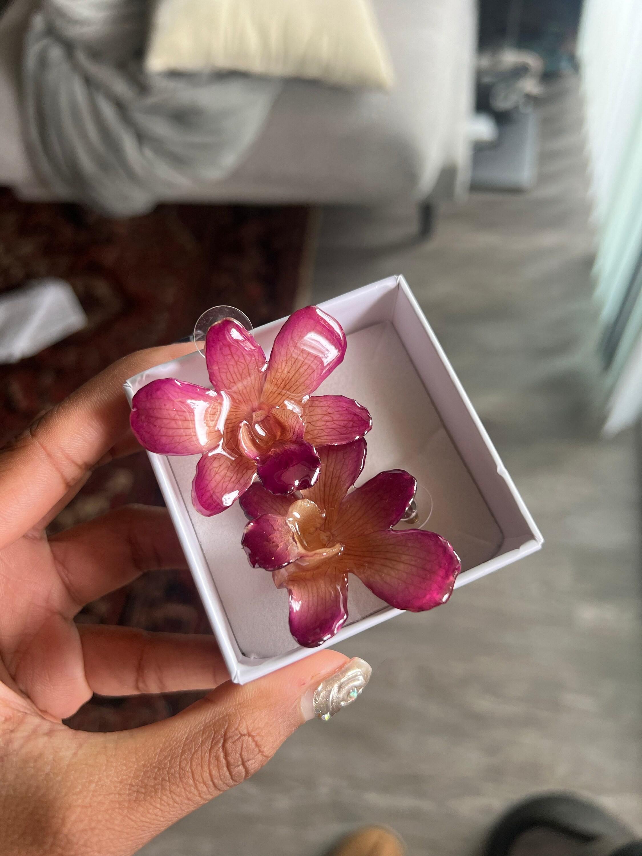 natural red orchid pendant earrings embedded in resin with silver hook. They are shipped with box and guarantee.