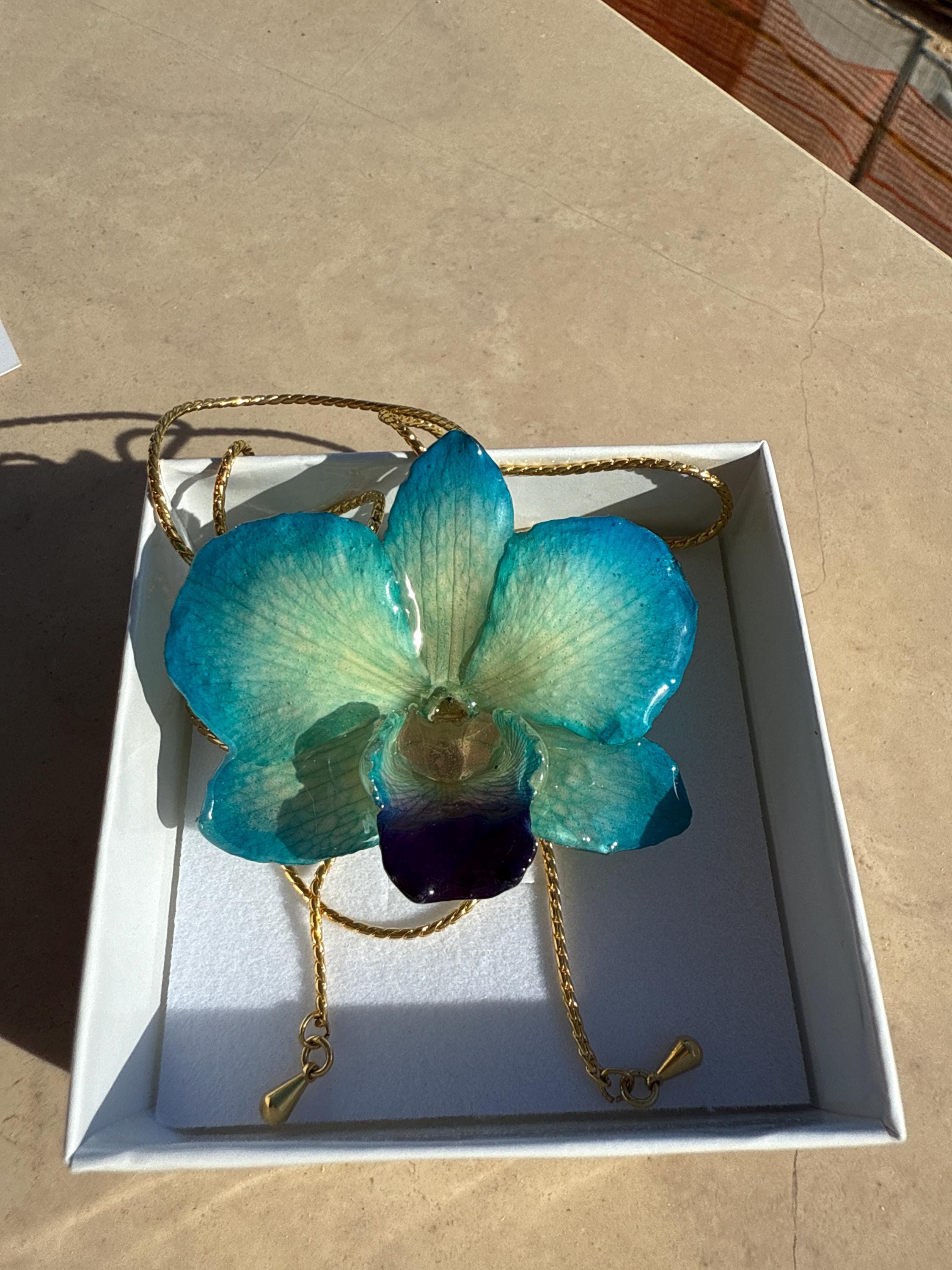 A blue orchid encased in resin and finished with a gold-on-bronze adjustable slider. Elegant and lightweight, it's suitable for any occasion. It comes with a box and warranty.
