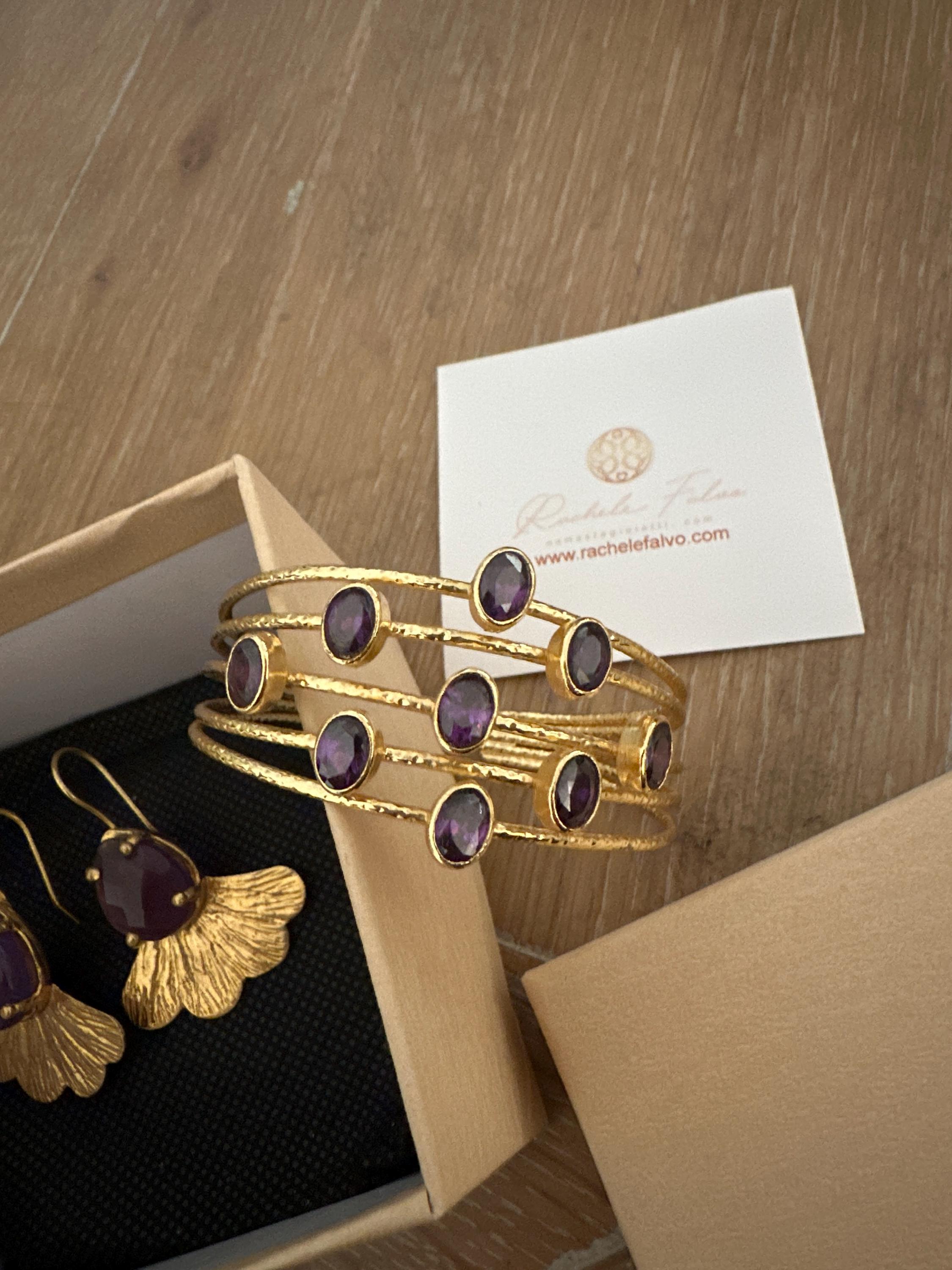 Spectacular adjustable bracelets in gold on bronze and finished with natural rose quartz or amethyst.