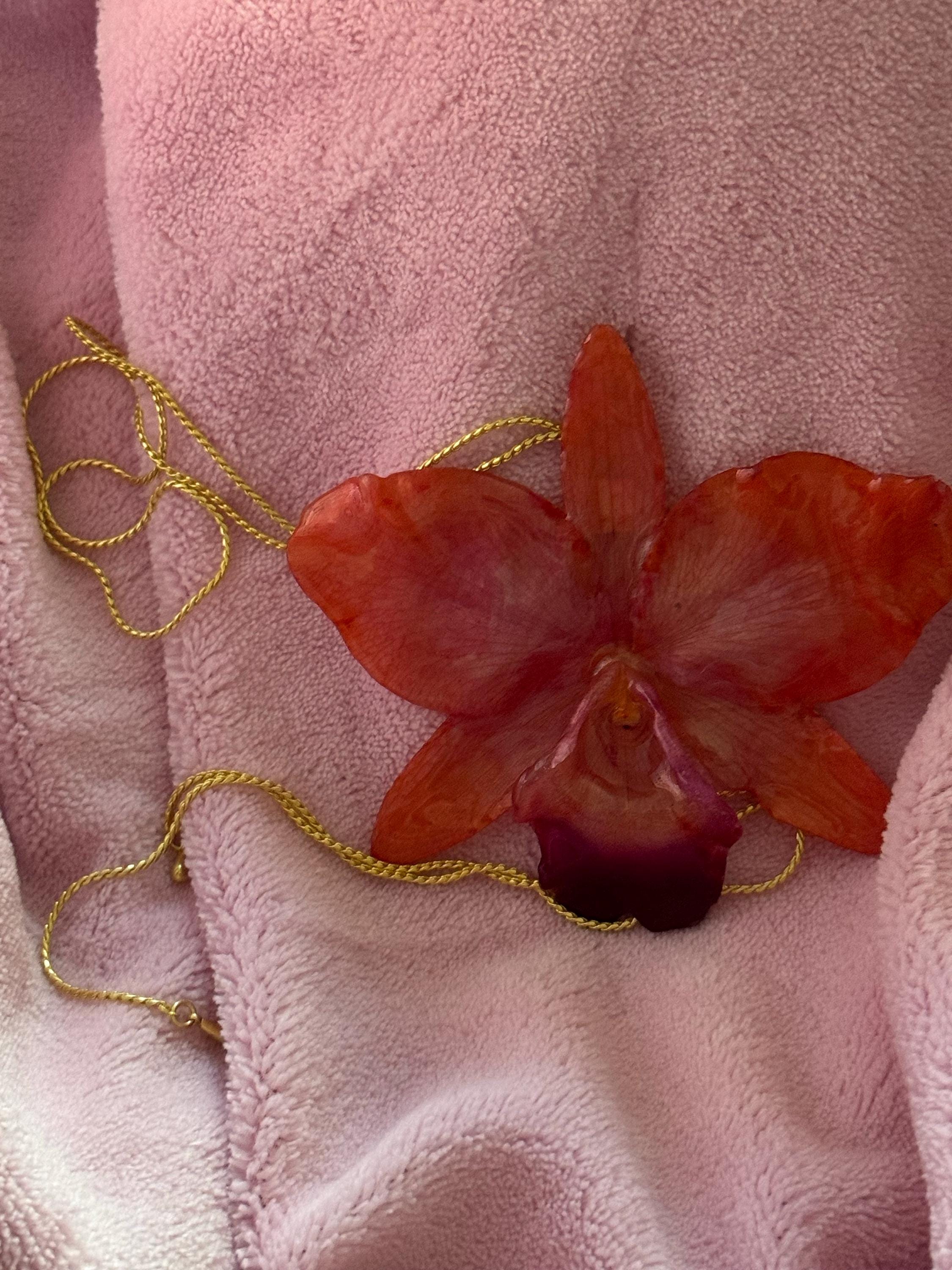 Elegant large orange Cattleya orchid embedded in resin and finished with gold on bronze adjustable height.