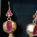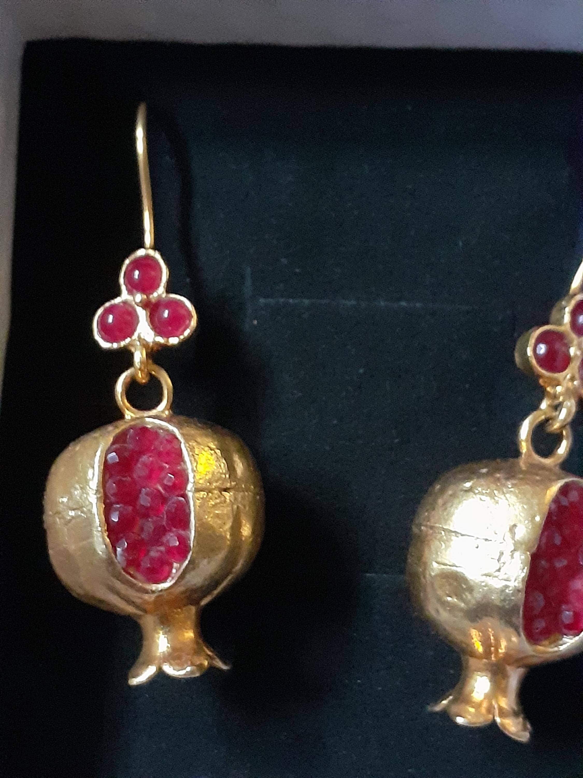 Pair of handcrafted earrings depicting lucky pomegranates, finished with red garnets worked in matte gold galvanization on bronze, unalterable and hypoallergenic.