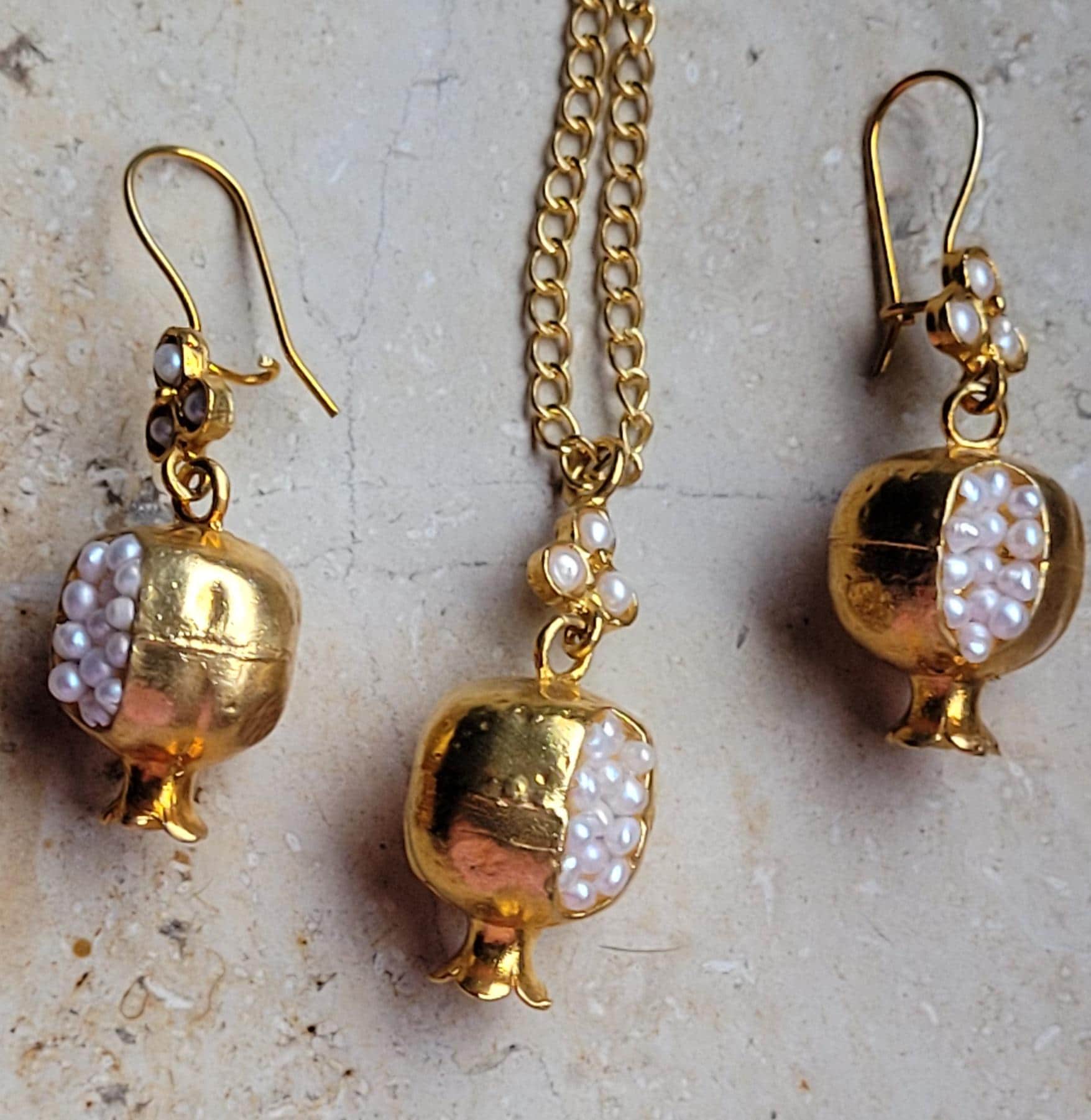 Pair of earrings in matte gold on bronze and finished with natural white pearls, light and elegant, suitable for any occasion, the Pomegranates symbolize good luck.